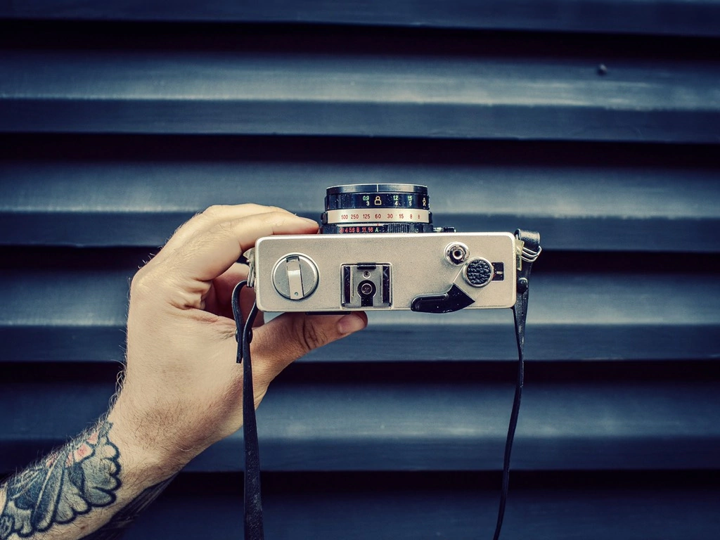Tapa, pila, flash,correa, funda y 1 film.